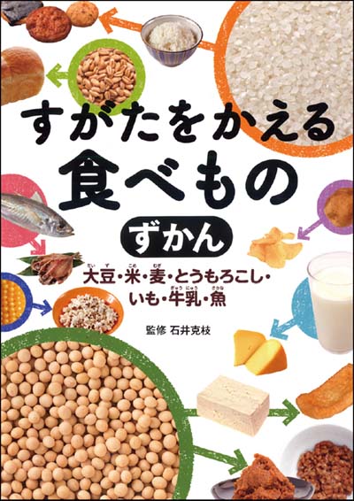 大豆、米、麦、とうもろこし、いも、牛乳、魚…。身近な食材がすがたを変えるようすを、くふうの言葉(動詞)を切り口に紹介。色々な加工を図にした“へんしんマップ”などの資料も掲載する。