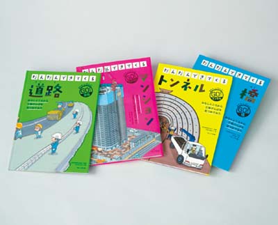 まちのなかで目にする「とっても大きなもの」が、だんだん形づくられていくようすをイラストで紹介するシリーズ。わたしたちの生活を足元から支えてくれる道路がどのようにつくられているのかを見ていく。